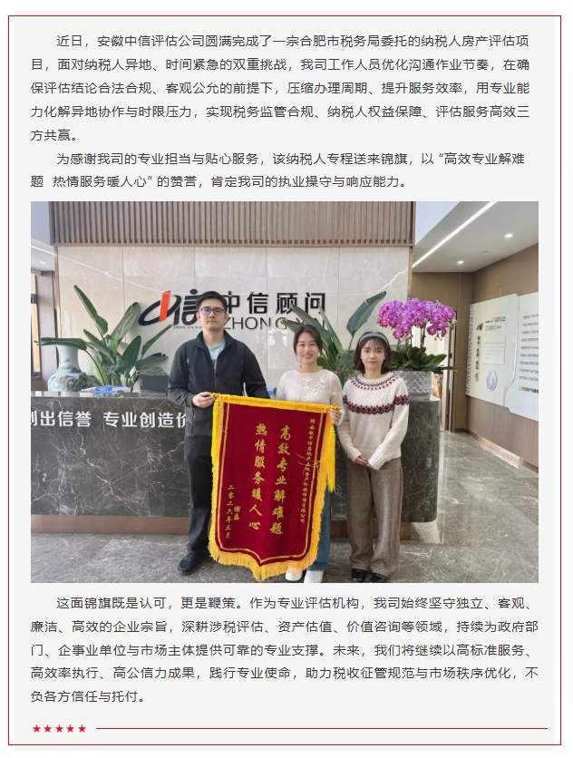 高效評(píng)估顯擔(dān)當(dāng) 錦旗致謝暖人心 —— 我司受托完成合肥涉稅房產(chǎn)評(píng)估獲納稅人高度贊譽(yù)